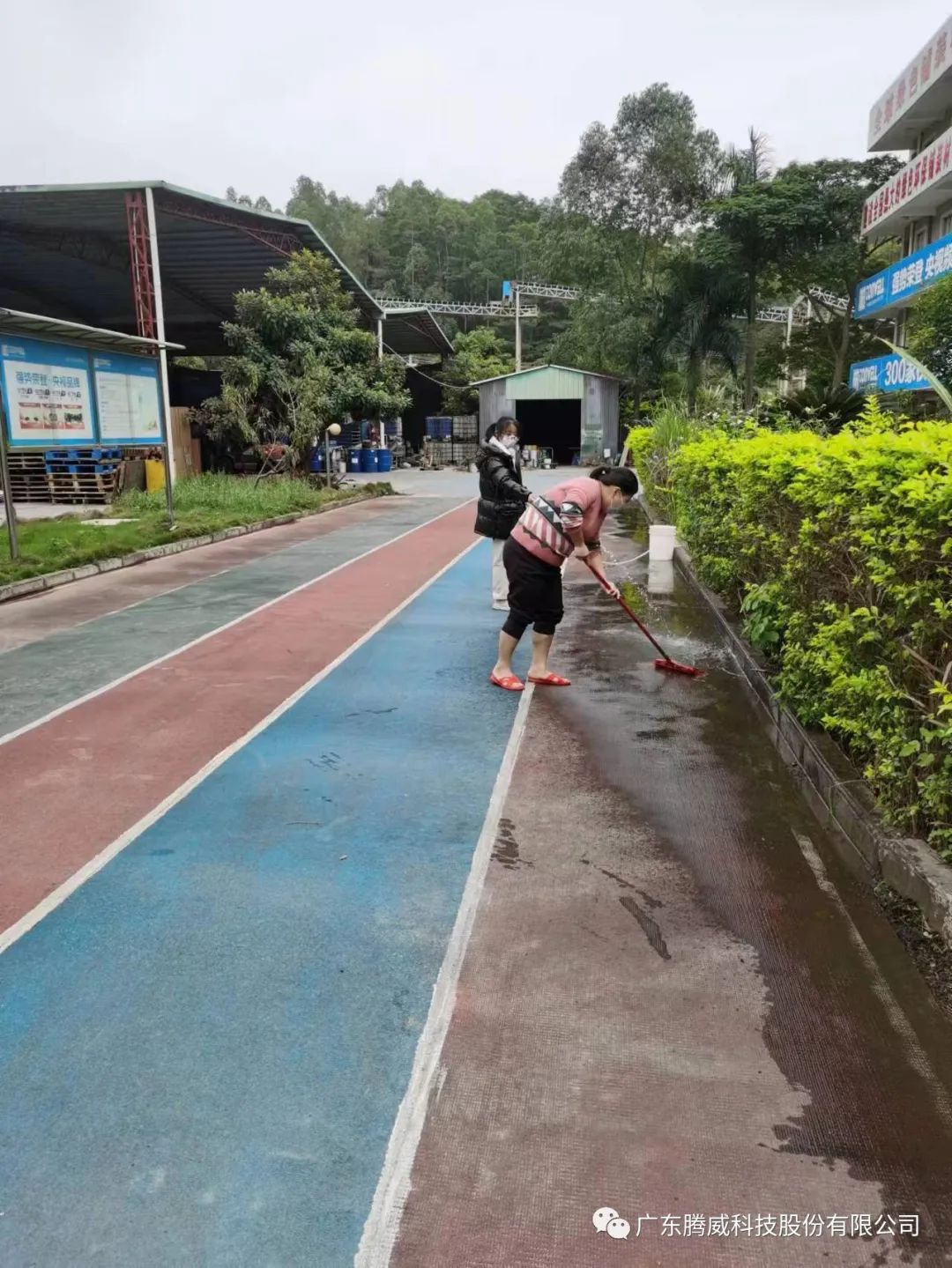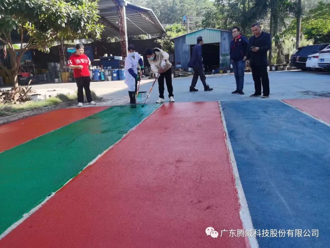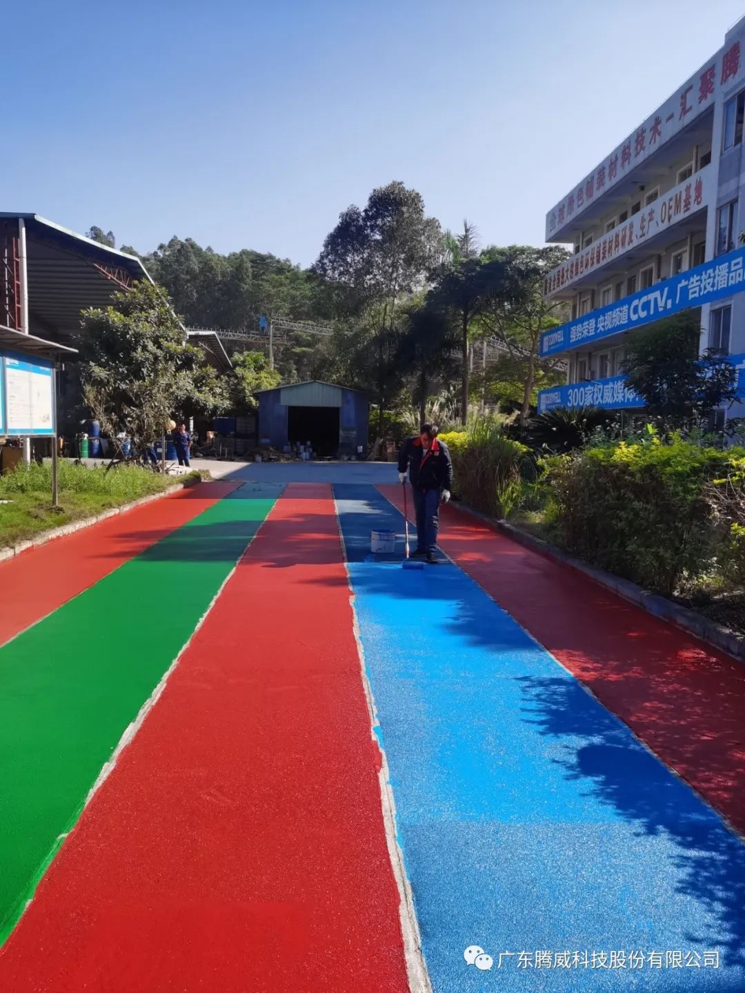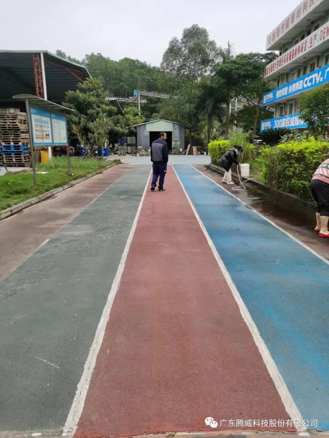 近日公司技術部同事對我司生產基地的彩虹跑道進行了翻新。采用材料為S-30聚脲耐磨面層材料。