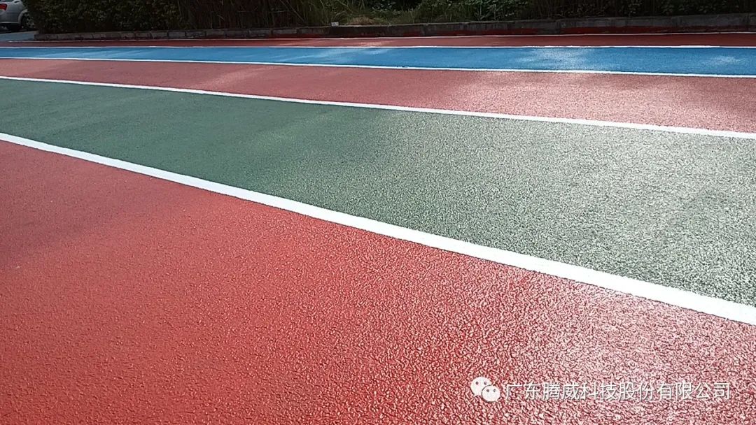公司彩虹跑道實驗鋪裝已經滿4年,含有紅、綠、藍三個顏色(其中一道為預制型卷材),表面沒有涂裝任何覆蓋層。歷經4年,綠色的稍有褪色,紅色、藍色跑道面漆都沒有褪色;表面污漬較多、但都沒有粉化掉色。